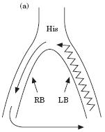 - A longer H-V interval during tachycardia as compared with sinus rhythm. This is paradoxical because one would expect it to be analogous to the situation with fascicular tachycardia, the wavefront in Bundle Branch Reentry Ventricular Tachycardia usually proceeds retrogradely through the left bundle branch system. It then divides with a portion continuing retrogradely to the site of the His bundle recording, and another portion turning anterogradely along the right bundle branch to the ventricle. Since this impulse enters the distal His bundle, and then proceeds retrogradely to the His bundle recording site and simultaneously anterogradely down the right bundle branch, one might expect the ventricle to be depolarized with an HV interval shorter than during sinus rhythm. This does not occur and the longer HV interval typically seen in BBRT is probably due to a combination of some effects of relative refractoriness of the right bundle and a predominant role of anisotropic conduction.
