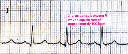 The normal range is from 60 to 100 bpm. There are several ways to calculate the rate that are listed below. To calculate the atrial rate you can locate two consecutive p waves and measure the number of large boxes between them. If there is 1 large box between the p waves then the rate is 300 bpm, 2 large boxes equals 150 bpm, 3 large boxes equals 75 bpm, 4 large boxes equals 60 bpm, 5 large boxes equals 50 bpm, and 6 large boxes equals 40 bpm. To calculate the ventricular rate measure the distance between the R to R intervals and apply the same rules.