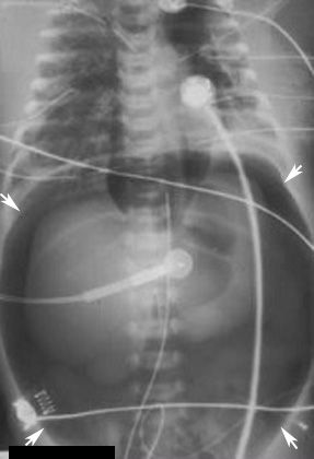 The football sign refers to a large oval radiolucency in the shape of an American football, which is seen on supine abdominal X-ray films.[1] The football sign is most frequently seen in infants with spontaneous or iatrogenic gastric perforation causing pneumoperitoneum.